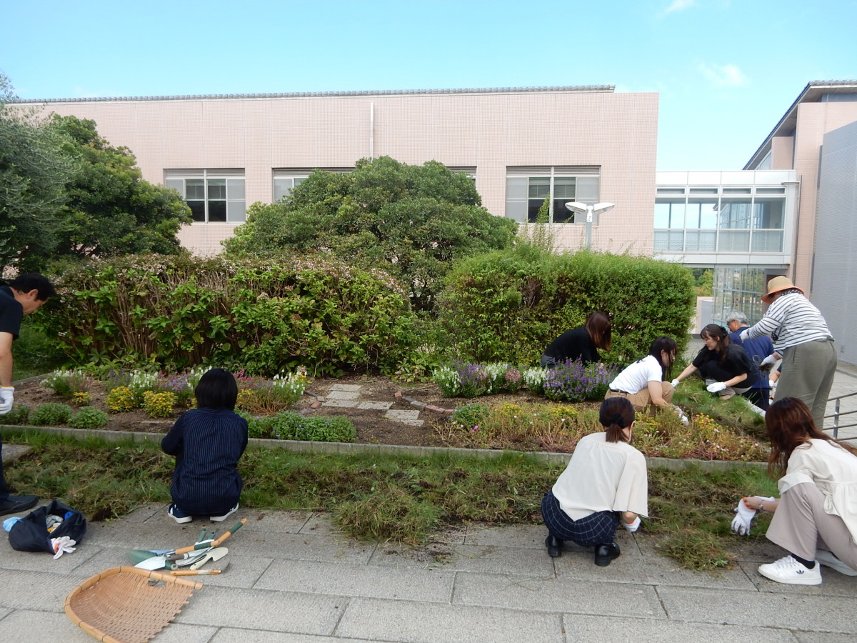 令和7年9月26日(金)昼、平岡都さん記念花壇「Garden of Hope」に教職員が集まり花壇の手入れを行いました。