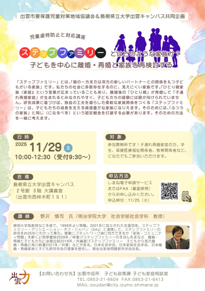 続きを読む出雲市要保護児童対策地域協議会と島根県立大学出雲キャンパスの共同企画「児童虐待防止と対応講座」のご案内です。今回は「ステップファミリーへの理解を深める」をテーマに開催いたします。ス...