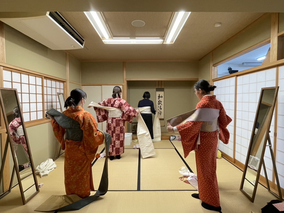 着物の着付けと聞くと、「難しそう」というイメージがあるかもしれません。しかし、部員のほとんどが初心者ですが、回を重ねる事に綺麗に自分で着物を着られるようになっています。もし、すこしでも着物に興味があればぜひ、覗きに来てみてください!