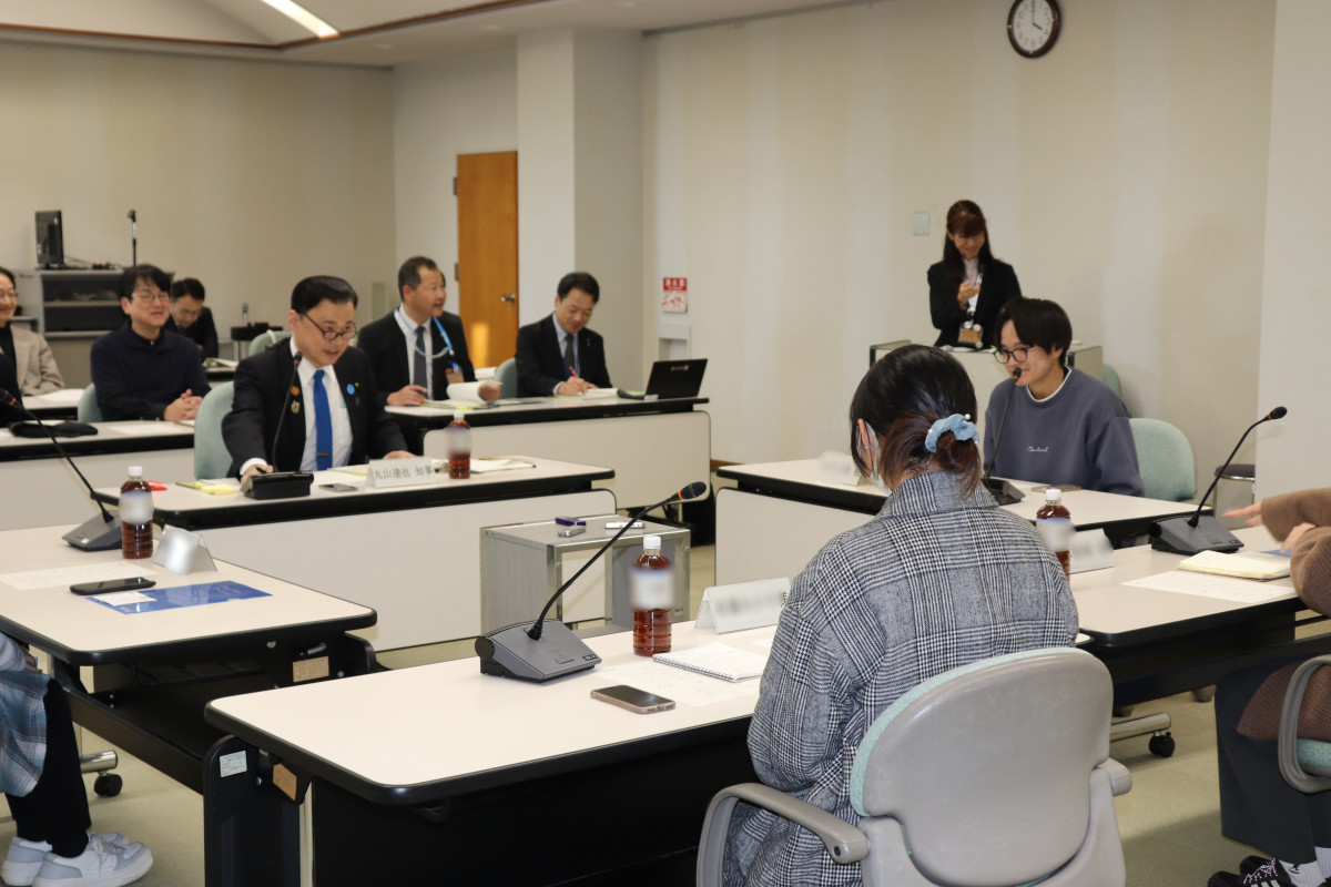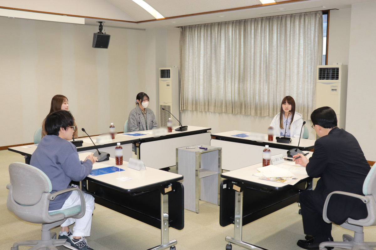島根県では、知事が各地で活躍している人たちと車座になって率直な意見交換を行う広聴会「知事と語る車座トーク」を開催しています。今回は、松江キャンパスで3学科の学生4名との車座トークです。学生は、大学生ならではの地域での取り組みや島根に対する熱い思いを語り、活発な意見交換が行われました。