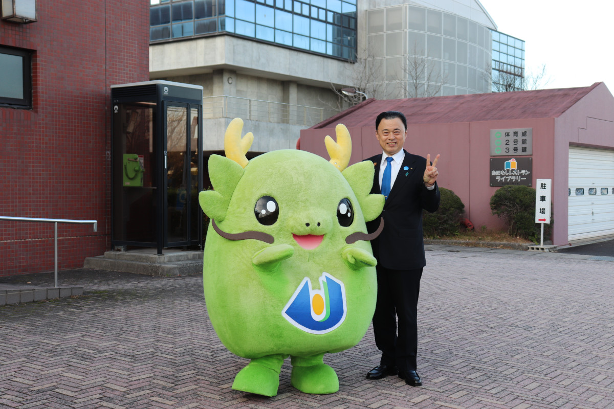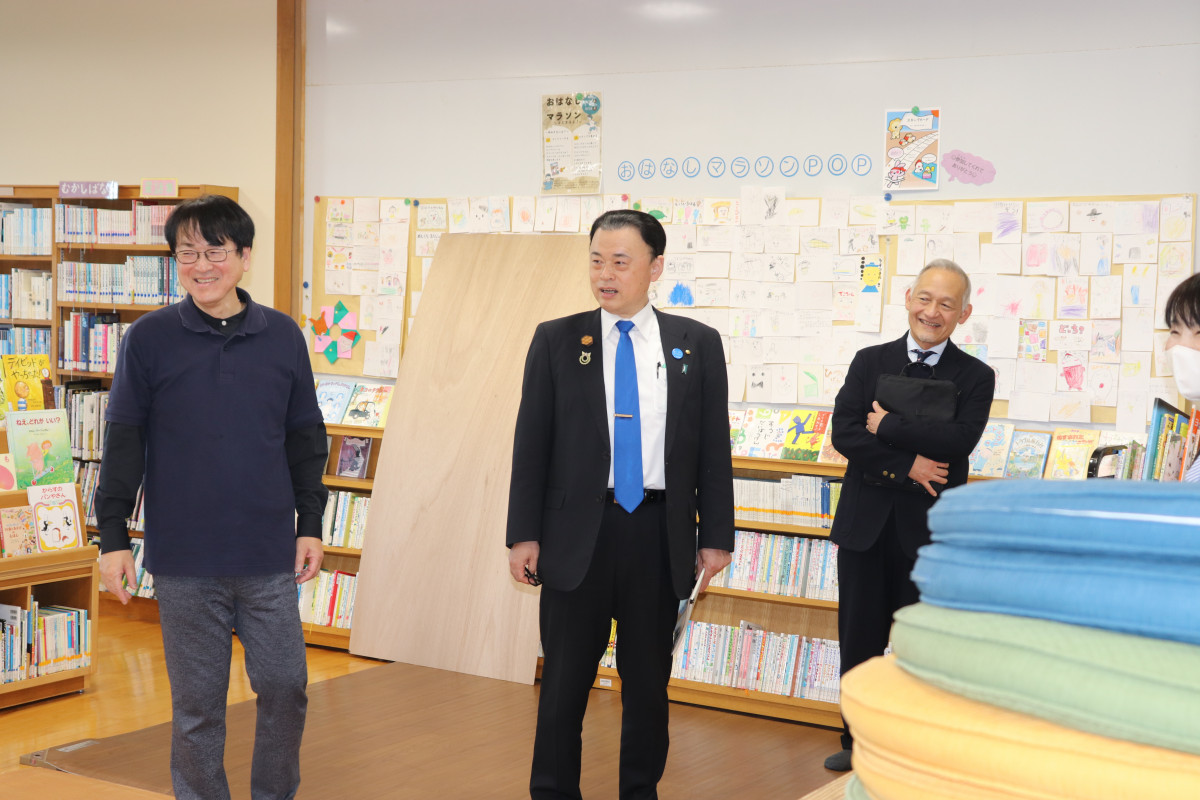 また車座トークの前には、副学長や司書からおはなしレストランライブラリーの紹介をしました。視察後に車座トーク会場へ移動される際、なんと本学マスコットキャラクターのオロリンと遭遇!キャンパスをバックに記念撮影をしていただきました。