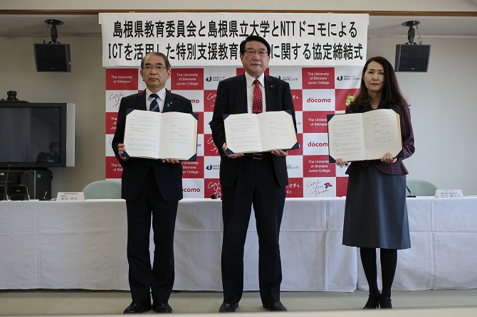 令和3年3月18日に、公立大学法人島根県立大学は、島根県教育委員会及び株式会社NTTドコモとICTを活用した特別支援教育の充実に関する連携協定を締結しました。