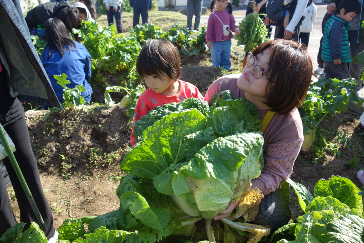 当日は、保育学科の学生が企画した「島根の野菜おいしいけん!かるた」や「やさい縁日」、さらにイチゴの苗植え、学生と松江農林高校の生徒が栽培した白菜、大根の収穫をしました。秋晴れの下、たくさんの野菜を収穫し、きっと良い思い出になったのではないでしょうか。参加してくれた皆さん、松江農林高校の皆さん、ありがとうございました。