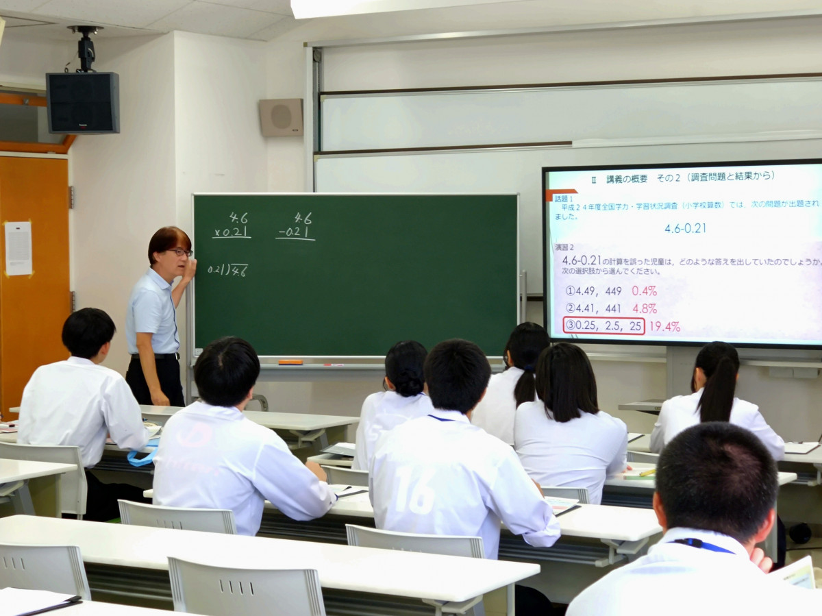 参加者の皆さんは、小学校の全国学力テストの問題を一緒に解きながら、保育教育学科:礒部教授より平均正答率について説明を受け、児童のつまずきに応じた算数の指導法や児童への声掛け等について学びました。